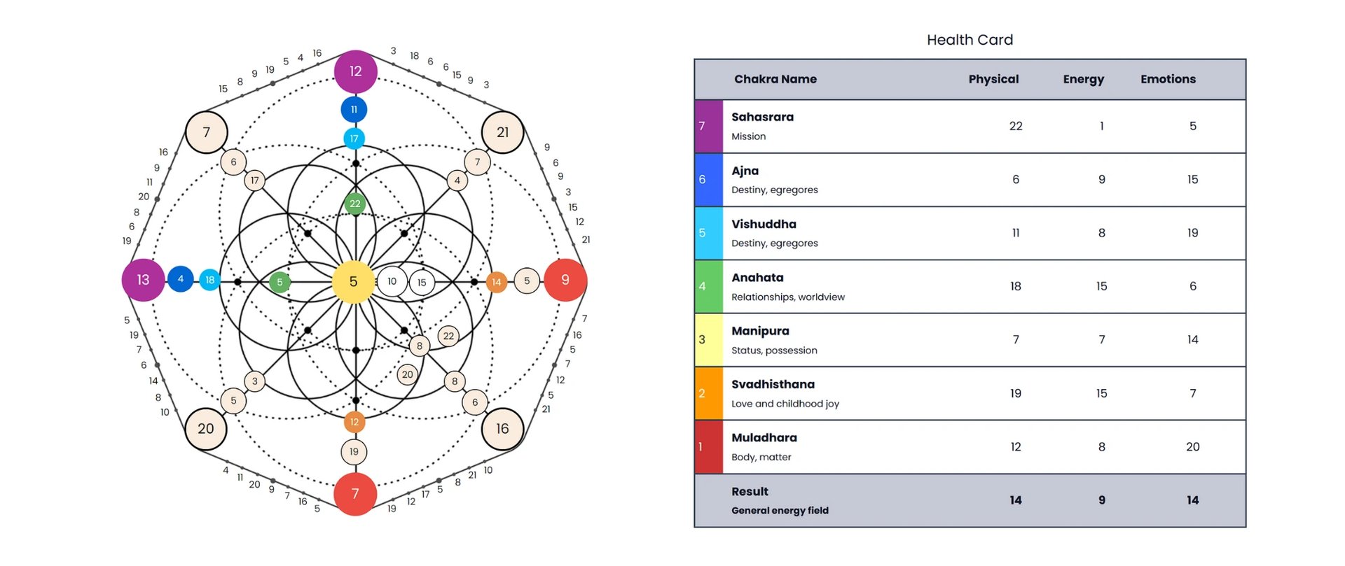 The "Health Card" section of your chart provides an overview of how your chakra energies align with your personal numbers. It highlights potential areas of imbalance or blockage and serves as a guide to maintain energetic harmony.